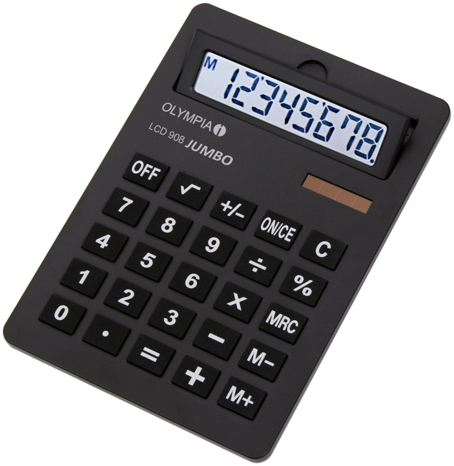 Olympia LCD 908 Jumbo. Διάταξη: Επιφάνεια εργασίας, Μοντέλο: Οθόνη αριθμομηχανής. Ψηφία: 8 ψηφία, Αριθμός γραμμών κειμένου: 1 γραμμή, Ανακλινόμενη οθόνη. Υπολογισμός φόρου. Πηγή ενέργειας: Μπαταρία/Ηλιακή ενέργεια. Χρώμα προϊόντος: Μαύρο