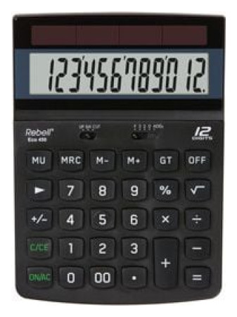 Η Rebell Eco 450 είναι μια φιλική προς το περιβάλλον αριθμομηχανή, 100% ηλιακή ενέργεια, δεν περιέχει μπαταρίες. Κατασκευάστηκε από 70% ανακυκλωμένο πλαστικό, χάρη στο οποίο έλαβε το πιστοποιητικό «Der Blaue Engel».{TAX function} Αρ. {Ενσωματωμένος εκτυπωτής} Αρ. {Τύπος εμφάνισης} 12 ψηφία. {κλειδί μηδέν} 00 . {Πλάτος [cm]} 13,3 . {Στρογγυλοποίηση} Ναι . {Additional Features} Grand Total . {Other} Υπολογισμοί ποσοστού . {Τύπος ισχύος} Ηλιακός . {Άλλα} Στοιχεία υπολογισμού. {Χρώμα} Μαύρο. {Other} Αλλάξτε το σύμβολο +/-. {Other} Κλειδί σήμανσης. Κουμπιά {Amount of memory} Μνήμη 3. Γραφείο {Purpose} . Αρχική σελίδα {Destiny}. {Πρόσθετες λειτουργίες} Κλειδί διόρθωσης. {Additional features} Επιλογέας δεκαδικών θέσεων. {Βάθος [cm]} 3,4 . {Ύψος [cm]} 18,4 . {Βάρος [g]} 183