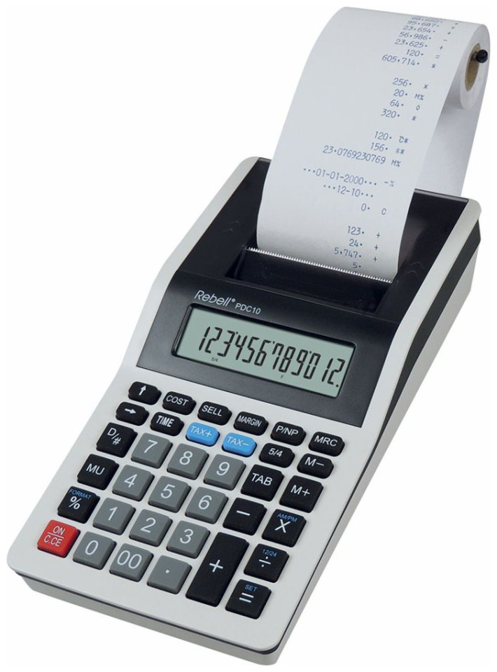Mały kalkulator z 12-cyfrowym wyświetlaczem, szybkością druku 1,4 linii/sek., czarną drukarką, podstawowymi funkcjami biznesowymi i możliwością wyboru zasilania baterią 4 x AAA lub zasilacz AC (zestaw nie zawiera zasilacza).