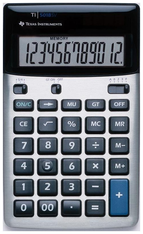 Texas Instruments TI-5018 SV. Διάταξη: Επιφάνεια εργασίας, Μοντέλο: Βασική αριθμομηχανή. Ψηφία: 12 ψηφία, Αριθμός γραμμών κειμένου: 1 γραμμή. Χρώμα προϊόντος: Μαύρο, Ασημί