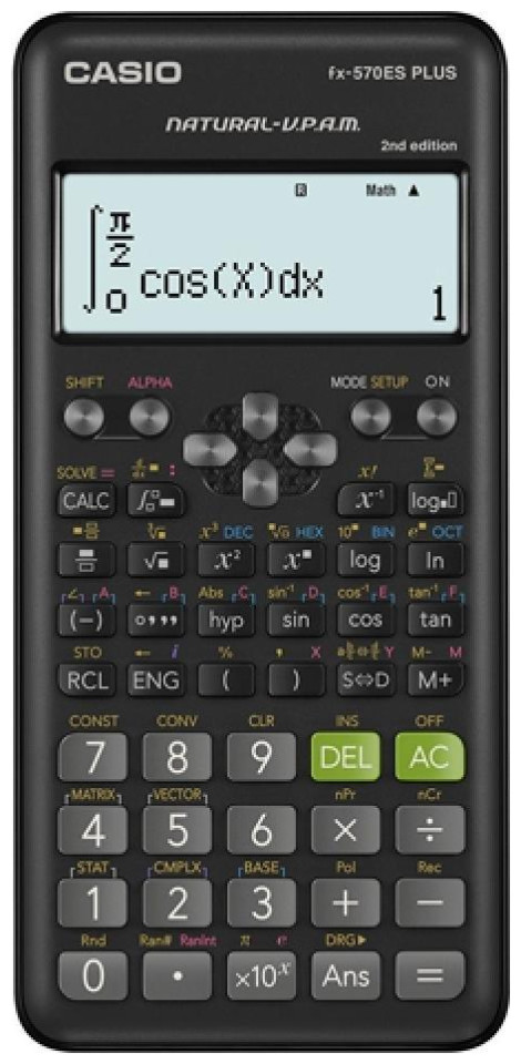 Wyświetlacz 31*96 punktowy Naturalny zapis wymiary 14 x 77 x 162 wyświetlanie wykładnika mantysy 10+2 Liczba znaków/linii 15/1+10/1 Regulacja kontrastu wyświetlacza Funkcja powtarzania, pamięć 9 zmiennych, 417 funkcji, 40 stałych naukowych, 40 konwersji jednostek, 24 poziomów nawiasów, ułamki zwykłe, konwersja między >DEG/>RAD/>GRAD, transformacja współrzędnych biegunowych Pol ÷ Rec, funkcje trygonometryczne sin/cos/tan/sin -1 /cos -1 /tan -1, funkcje hiperboliczne sinh/cosh/tanh/sinh -1 /cosh -1 /tanh -1wykładnik, log, In, 10 x , e x, funkcje matematyczne ?, x2, x-1, 1/x, x!, xy, x1/y, binarny, ósemkowy i szesnastkowy system liczbowy, operatory logiczne ( i , lub …), obliczenia w systemie sześćdziesiętnym < > dziesiętnym, liczby zespolone, notacja inżynierska, operacje na macierzach (3x3), obliczenia na macierzach i wektorach, generator liczb losowych, tabela funkcji całki , pochodne , różniczki, macierze, zaawansowana statystyka i regresja, rozwiązywanie równań i układów równań, logarytm dziesiętny , naturalny i o dowolnej podstawie, wartość bezwzględna twarda obudowa automatyczne wyłączanie zasilanie : bateria (1x R03/AAA) 3 lata gwarancji kolor: czarny EAN: 4549526612077