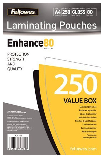 Fellowes Fellowes A4 Glossy 80 Micron Laminating Pouch - 250-pack - 5312903