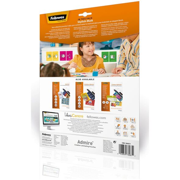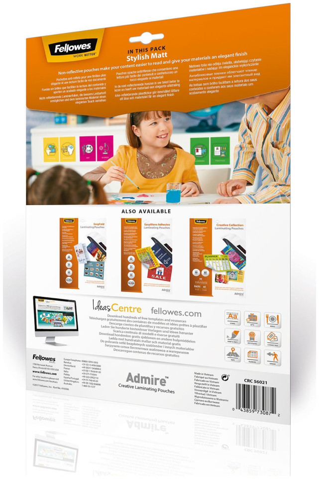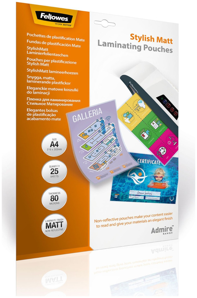 Fellowes 5602101. Υλικά: τερεφθαλικό πολυαιθυλένιο (PET), Φινίρισμα επιφάνειας: Ματ, Μέγεθος μέσου (Δίσκος 1): Α4. Πλάτος προϊόντος: 216 mm, Βάθος προϊόντος: 0,2 mm, Ύψος προϊόντος: 303 mm. Ποσότητα ανά συσκευασία: 25 τεμ. Προϊόντα σε κύριο (εξωτερικό) κουτί: 10 τεμ.{Μέγεθος} Α4 . {Μέγεθος} Α4