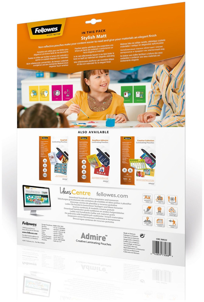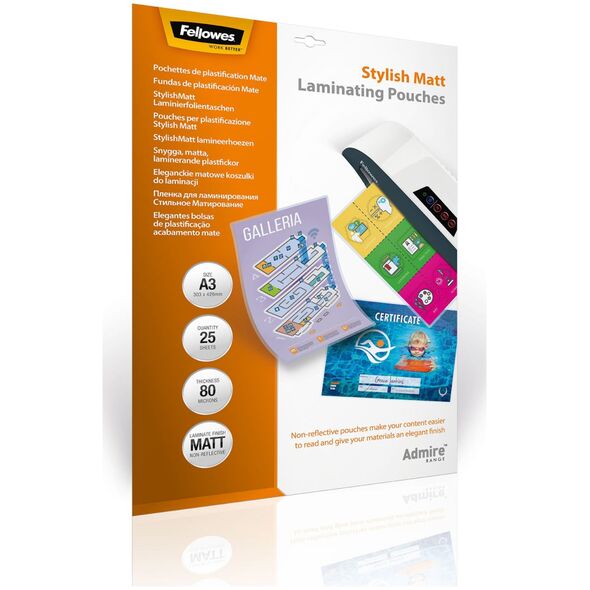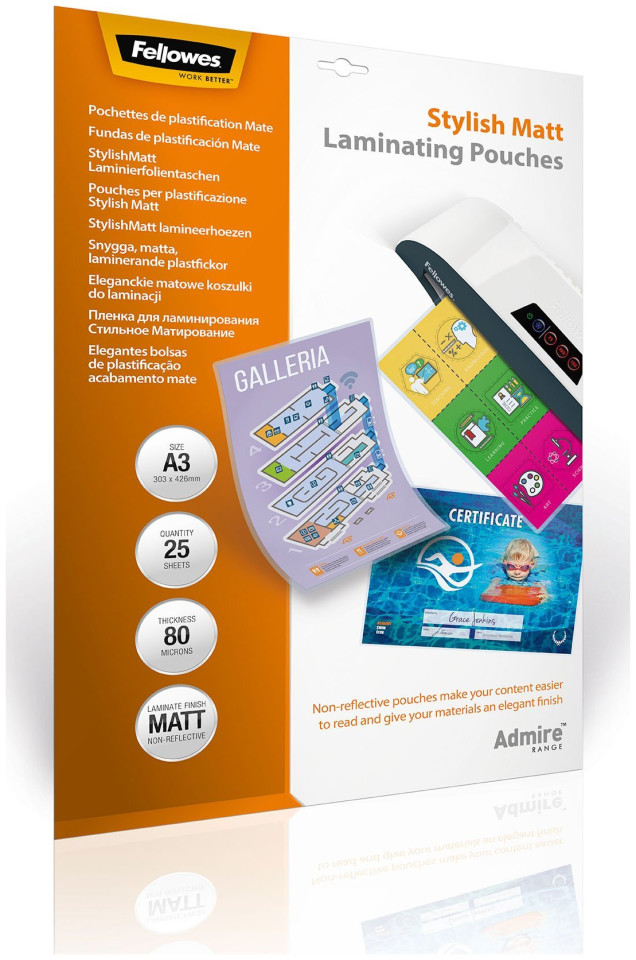 Fellowes 5602201. Φινίρισμα επιφάνειας: Ματ, Μέγεθος μέσου (Δίσκος 1): A3, Πάχος: 0,08 mm. Πλάτος προϊόντος: 303 mm, Βάθος προϊόντος: 0,2 mm, Ύψος προϊόντος: 426 mm. Ποσότητα ανά συσκευασία: 25 τεμ. Προϊόντα σε κύριο (εξωτερικό) κουτί: 5 τεμ.{Μέγεθος} Α3 . {Μέγεθος} Α3 . {Ποσότητα} 25 τεμ. {Ποσότητα} 25 τεμ.