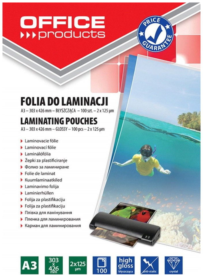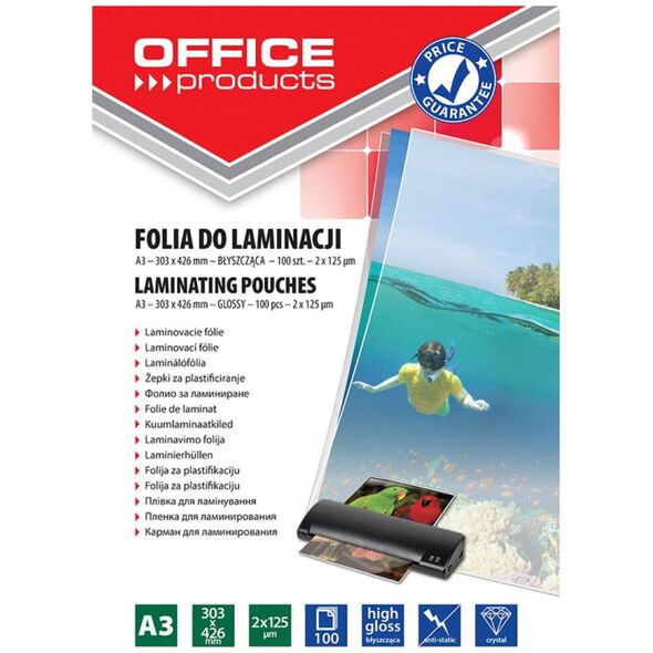 Office Products Φύλλο πλαστικοποίησης OFFICE PRODUCTS, A3, 2x125 μικρά, γυαλιστερό, 100 τεμάχια, διαφανές