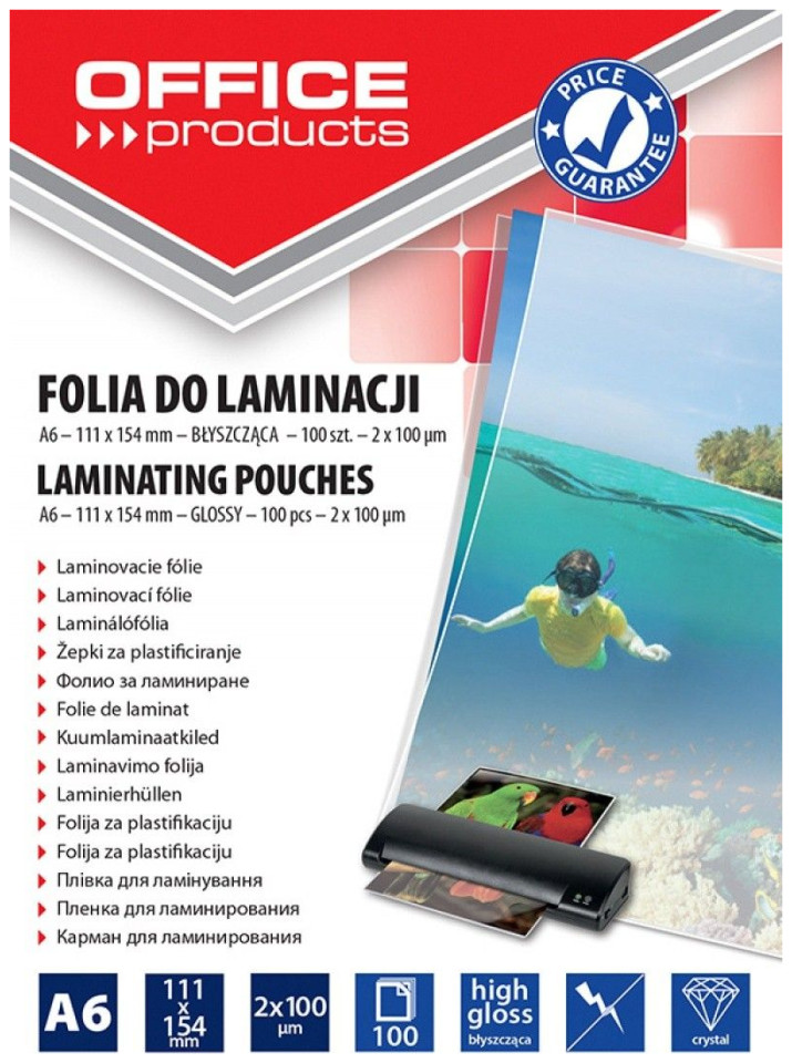 Office Products Φύλλο πλαστικοποίησης OFFICE PRODUCTS, A6, 2x100μικρ., γυαλιστερό, 100τεμ., διαφανές