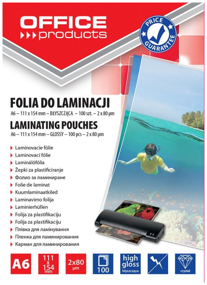 Office Products Φύλλο πλαστικοποίησης OFFICE PRODUCTS, A6, 2x80μικρ., γυαλιστερό, 100τεμ., διαφανές