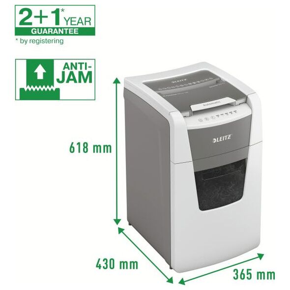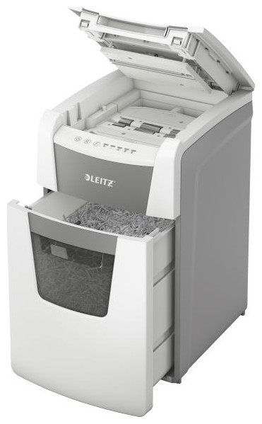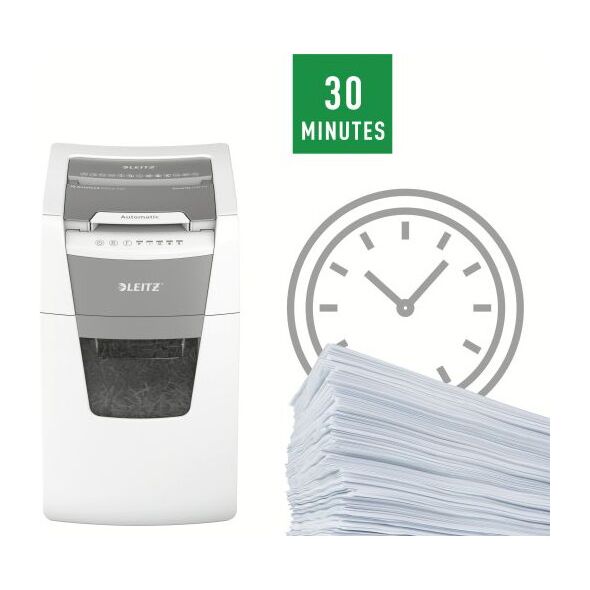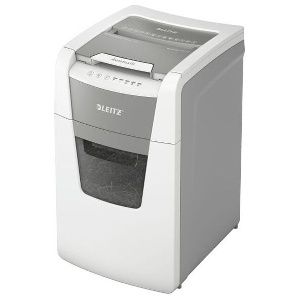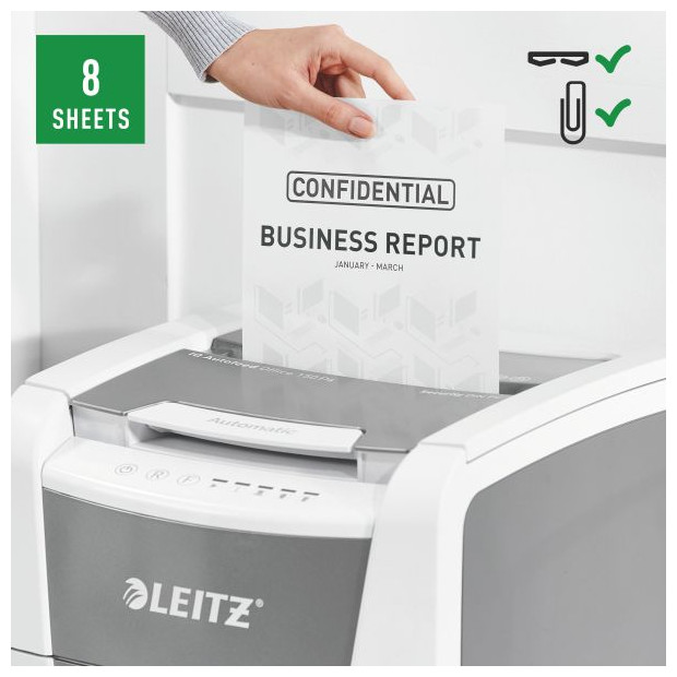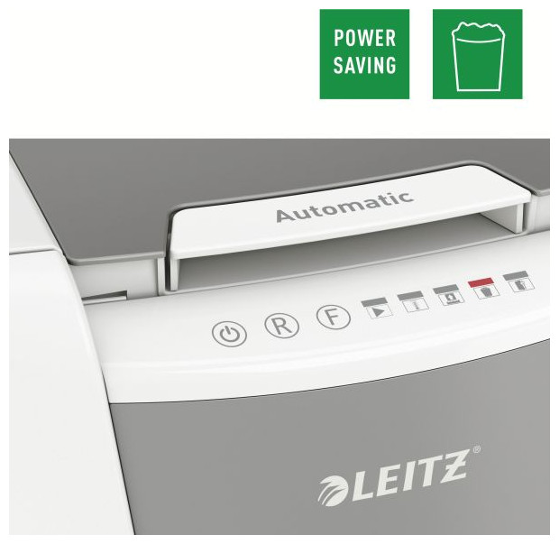 Πλήρως αυτόματος τεμαχιστής χαρτιού Leitz με μοναδική λειτουργία αυτοκαθαρισμού. Τόσο έξυπνο που το μόνο που χρειάζεται να κάνετε είναι να εισάγετε μια στοίβα φύλλα χαρτιού (συμπεριλαμβανομένων συρραπτικών και συνδετήρων), να κλείσετε το καπάκι και να επιστρέψετε στις δραστηριότητές σας ενώ λειτουργεί αθόρυβα και κάνει τη δουλειά μόνο του. Ιδανικό για γραφεία. Εγγυάται εξαιρετική απόδοση - αποτρέπει τις εμπλοκές, είναι αθόρυβο και μπορεί να λειτουργήσει για 30 λεπτά χωρίς διακοπή. Καταστρέφει αυτόματα έως και 150 φύλλα Α4 κάθε φορά, κόβοντάς τα σε κομφετί με επίπεδο ασφαλείας P-4 (4 x 28 mm) και τοποθετώντας τα κομμένα φύλλα σε ένα μεγάλο δοχείο 44 λίτρων. Ο πίνακας ελέγχου αφής εγγυάται την εύκολη και διαισθητική λειτουργία της συσκευής.