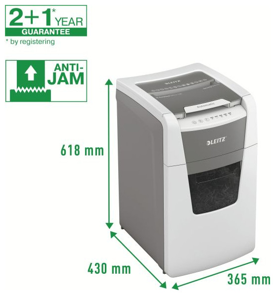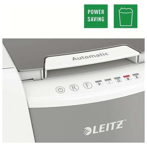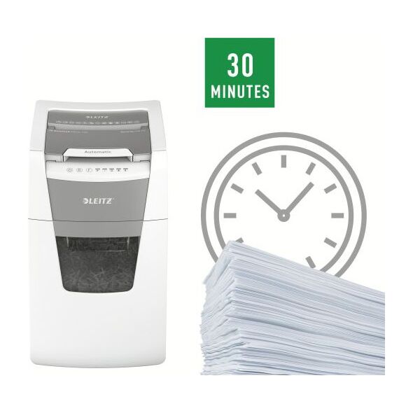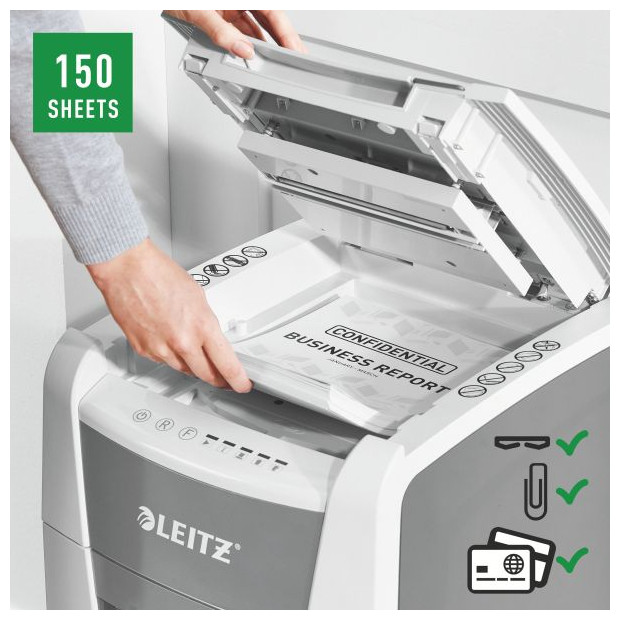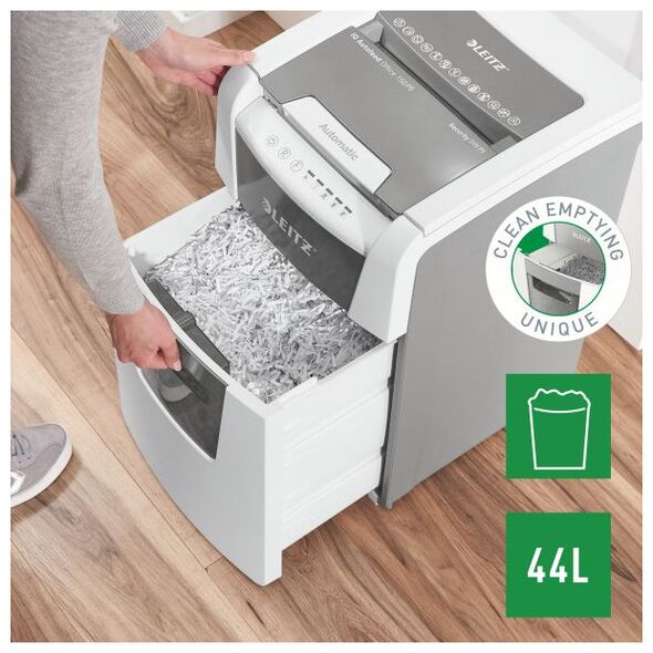 Πλήρως αυτόματος τεμαχιστής χαρτιού Leitz με μοναδική λειτουργία αυτοκαθαρισμού. Τόσο έξυπνο που το μόνο που χρειάζεται να κάνετε είναι να εισάγετε μια στοίβα φύλλα χαρτιού (συμπεριλαμβανομένων συρραπτικών και συνδετήρων), να κλείσετε το καπάκι και να επιστρέψετε στις δραστηριότητές σας ενώ λειτουργεί αθόρυβα και κάνει τη δουλειά μόνο του. Ιδανικό για γραφεία. Εγγυάται εξαιρετική απόδοση - αποτρέπει τις εμπλοκές, είναι αθόρυβο και μπορεί να λειτουργήσει για 30 λεπτά χωρίς διακοπή. Καταστρέφει αυτόματα έως και 150 φύλλα Α4 κάθε φορά, κόβοντάς τα σε μικρο-κομμάτια με επίπεδο ασφαλείας P-5 (2 x 15 mm) και τοποθετώντας τα κομμένα φύλλα σε ένα μεγάλο δοχείο 44 λίτρων. Ο πίνακας ελέγχου αφής εγγυάται την εύκολη και διαισθητική λειτουργία της συσκευής.