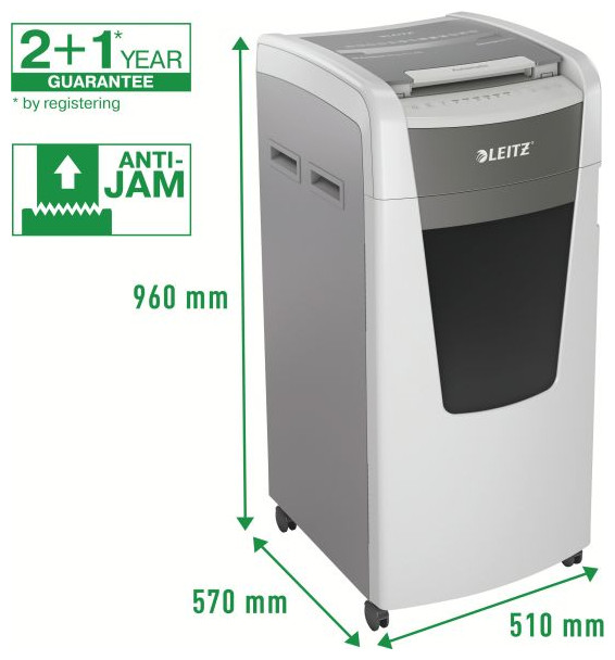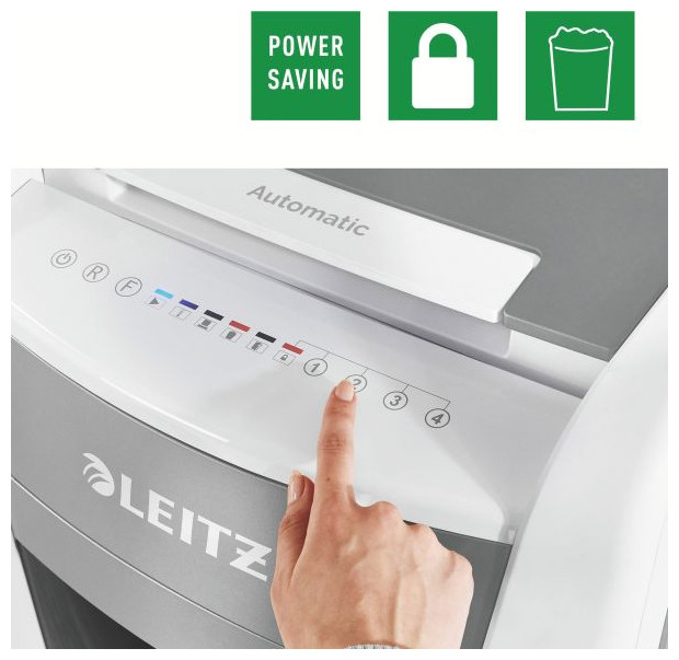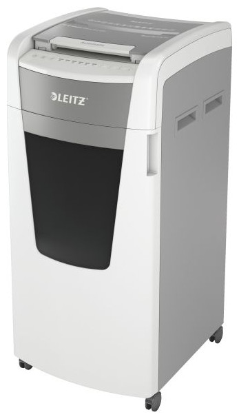 Πλήρως αυτόματος τεμαχιστής χαρτιού Leitz με μοναδική λειτουργία αυτοκαθαρισμού. Τόσο έξυπνο που το μόνο που χρειάζεται να κάνετε είναι να εισάγετε μια στοίβα φύλλα χαρτιού (συμπεριλαμβανομένων συρραπτικών και συνδετήρων), να κλείσετε το καπάκι και να επιστρέψετε στις δραστηριότητές σας ενώ λειτουργεί αθόρυβα και κάνει τη δουλειά μόνο του. Εγγυάται εξαιρετική απόδοση - αποτρέπει τις εμπλοκές, είναι αθόρυβο και μπορεί να λειτουργήσει για 240 λεπτά χωρίς διακοπή. Καταστρέφει αυτόματα έως και 600 φύλλα Α4 κάθε φορά, κόβοντάς τα σε μικρο-κομμάτια με επίπεδο ασφαλείας P-5 (2 x 15 mm) και τοποθετώντας τα κομμένα φύλλα σε ένα μεγάλο δοχείο 110 λίτρων. Ο πίνακας ελέγχου αφής εγγυάται την εύκολη και διαισθητική λειτουργία της συσκευής.
