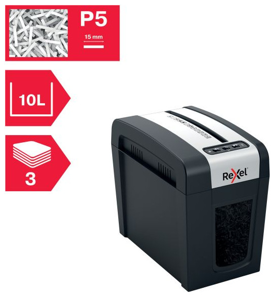 Η σειρά τεμαχιστών Secure Whisper-Shred™ της Rexel είναι ιδανική για τον τεμαχισμό προσωπικών εγγράφων και εμπιστευτικών πληροφοριών στο σπίτι. Το μοντέλο Secure MC3-SL καταστρέφει ταυτόχρονα -μετά από τη χειροκίνητη τροφοδοσία μέσω της υποδοχής του τροφοδότη- έως και 3 φύλλα χαρτιού A4 (80 gsm), κόβοντάς τα σε μικροκόμματα διαστάσεων 2 x 15 mm, γεγονός που εξασφαλίζει επίπεδο ασφάλειας P-5. Λεπτό και συμπαγές - ιδανικό για χρήση στο σπίτι και στο γραφείο στο σπίτι. Είναι επίσης τέλειος ως προσωπικός καταστροφέας σε γραφεία, καθώς χωράει άνετα κάτω από το γραφείο και εξασφαλίζει αθόρυβη λειτουργία. Το δοχείο των 10 λίτρων επιτρέπει το λιγότερο συχνό άδειασμα των αποκομμάτων και προορίζεται για περιστασιακή ή μέτρια χρήση.