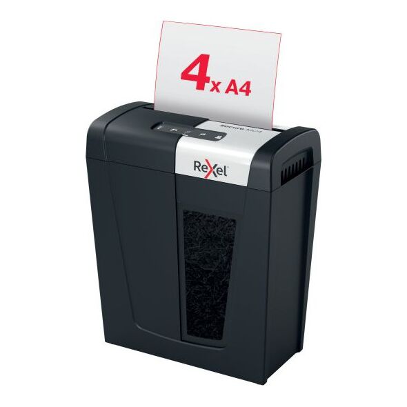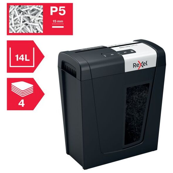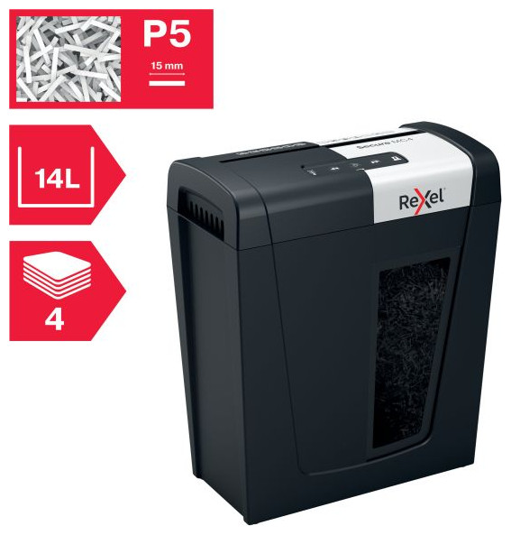 Linia niszczarek Secure Whisper-Shred™ firmy Rexel doskonale nadaje się do niszczenia osobistych dokumentów i poufnych informacji w domu. Model Secure MC4 niszczy jednocześnie - po ręcznym podaniu przez szczelinę podajnika - do 4 arkuszy papieru A4 (80 gsm), tnąc je na mikrościnki o wymiarach 2 x 15 mm, co zapewnia poziom bezpieczeństwa P-5. Mała i kompaktowa - idealnie nadaje się do użytkowania w domu i w domowym biurze. Znakomicie się także sprawdzi jako niszczarka osobista w biurach, mieszcząc się wygodnie pod biurkiem i zapewniając cichą pracę. 14-litrowy pojemnik umożliwia rzadsze opróżnianie ze ścinków, przeznaczona jest do sporadycznego lub umiarkowanego użytkowania.