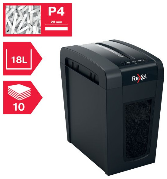 Η σειρά τεμαχιστών Secure Whisper-Shred™ της Rexel είναι ιδανική για τον τεμαχισμό προσωπικών εγγράφων και εμπιστευτικών πληροφοριών στο σπίτι. Το μοντέλο Secure X10-SL καταστρέφει ταυτόχρονα - μετά από χειροκίνητη τροφοδοσία μέσω της υποδοχής τροφοδοσίας - έως και 10 φύλλα χαρτιού A4 (80 gsm), κόβοντάς τα σε κομφετί 4 x 40 mm, γεγονός που εξασφαλίζει επίπεδο ασφάλειας P-4. Στενό και συμπαγές - ιδανικό για χρήση στο σπίτι και στο γραφείο στο σπίτι. Είναι επίσης τέλειος ως προσωπικός καταστροφέας σε γραφεία, καθώς χωράει άνετα κάτω από το γραφείο και εξασφαλίζει αθόρυβη λειτουργία. Το δοχείο των 18 λίτρων επιτρέπει λιγότερο συχνό άδειασμα των αποκομμάτων. Ο καταστροφέας προορίζεται για περιστασιακή ή μέτρια χρήση.