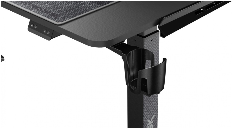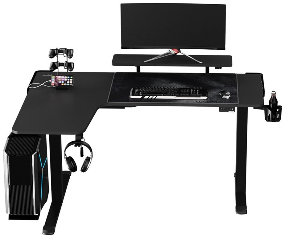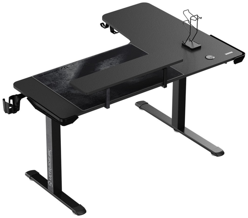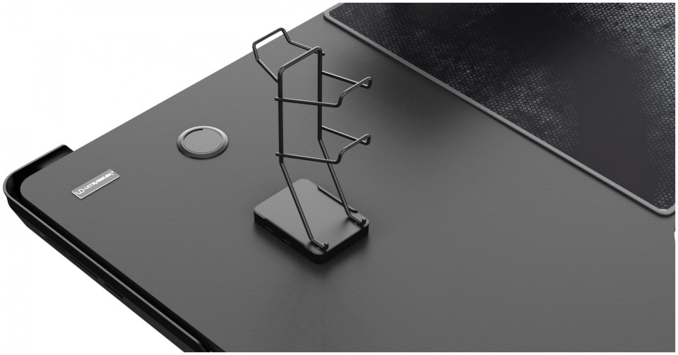 ULTRADESK Biurko dla gracza WINGER - czarny, 111x155x60 cm, 75-122 cm, elektycznie regulowany, podświetlenie RGB, uchwyt na słucha