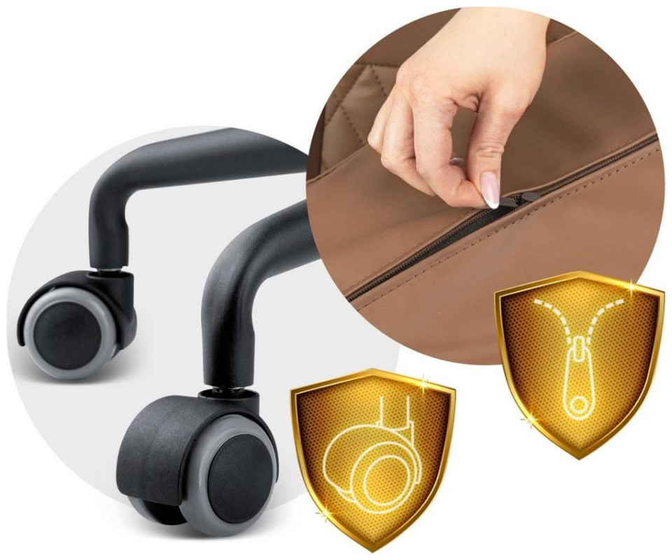 Τα μαξιλάρια μπορούν να αφαιρεθούν από το κάλυμμα χάρη σε ένα ραμμένο φερμουάρ και η συμπαγής μεταλλική βάση είναι εξοπλισμένη με νάιλον και ελαστικούς τροχούς που κινούνται αθόρυβα και δεν γρατσουνίζουν το πάτωμα.