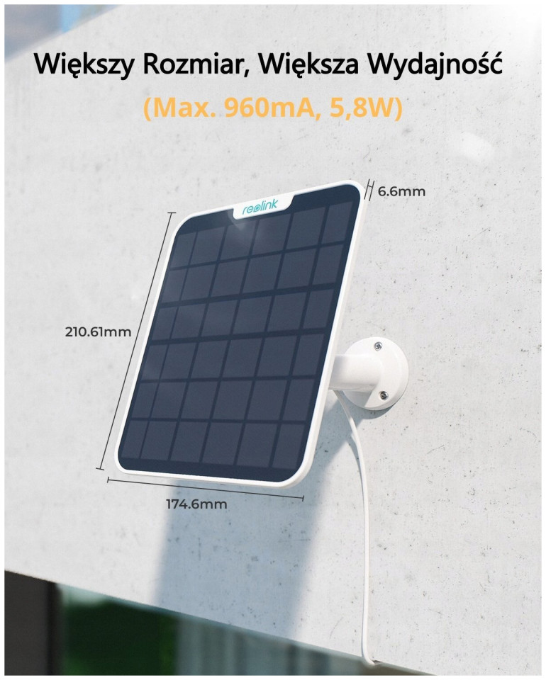 Reolink Panel Solarny 2 CamouflageReolink Panel Solarny 2 jest mocniejszy od swojego poprzednika 2-krotnie - Służy do doładowywania wszystkich modeli kamer akumulatorowych marki Reolink. Reolink GO PLUS, REOLINK GO PT, REOLINK GO PT PLUS, Reolink Argus 2, Reolink Argus 2E, Reolink Argus 3, Reolink Argus 3 PRO, Reolink Argus PT, Reolink Argus PT 2K Reolink Argus ECO, Reolink DUO, Reolink DUO 4G, DUO 2, DUO 2 LTE, Trackmix akumulatorowa LTEModel: Panel solarny 2 Reolink camouflage moro Modele współpracujące: Wszystkie kamery akumulatorowe Reolink Wodoodporny: tak IP65 Akcesoria: uchwyt Długość przewodu: 4,5 metra Moc wyjścowa: 5,8W, 960mA, 6 Volt Wymiary: 210,61x174,6 Wtyk: Micro USB typ C