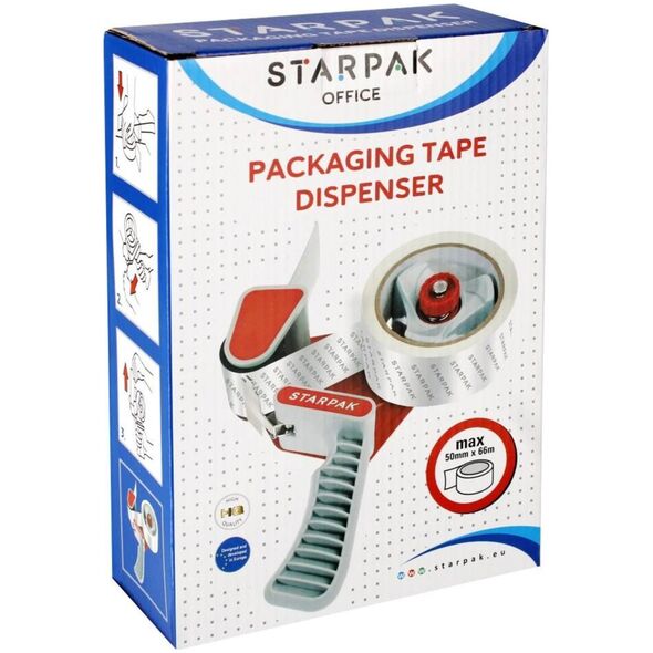 Πλεονεκτήματα προϊόντος: Μηχανή συσκευασίας STARPAK, διανομέας για ταινία πλάτους έως 48 mm. Στιβαρή κατασκευή από μέταλλο και ανθεκτικά υλικά. Συσκευασμένο σε κουτί. Διαστάσεις συσκευασίας: πλάτος x ύψος cm 16x23. Βάρος συσκευασίας kg. 0,43 κιλά. Προϊόν που προορίζεται για ηλικίες 3 ετών. Συσκευασμένο σε 12 τεμάχια. Συσκευασμένο σε κουτί των 24 τεμαχίων.