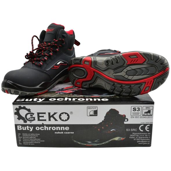 Υψηλής ποιότητας, λειτουργικά δερμάτινα παπούτσια εργασίας PREMIUM, κατηγορίας S3 SRC. Παπούτσια από τη διάσημη μάρκα GEKO σχεδιασμένα να προστατεύουν τα πόδια από εξωτερικούς παράγοντες, σχεδιασμένα με τέτοιο τρόπο ώστε να βελτιώνουν την άνεση και την ασφάλεια της εργασίας. Υποδήματα συμβατά με το πρότυπο που καθορίζει τις απαιτήσεις για ασφαλή υποδήματα: CE EN ISO 20345:2011. Το Nubuck είναι ένα απαλά γυαλισμένο επάνω μέρος του δέρματος. Ακριβώς όπως το σουέτ, έχει μια λεπτή δομή και είναι πολύ ευχάριστο στην αφή. Πολλοί άνθρωποι φοβούνται ότι το nubuck, όπως το σουέτ, είναι ένα υλικό που δεν είναι πολύ ανθεκτικό στη φθορά - τίποτα δεν θα μπορούσε να απέχει περισσότερο από την αλήθεια. Με σωστή συντήρηση και καθαρισμό, τα παπούτσια nubuck θα διατηρήσουν την κομψή τους εμφάνιση για μεγάλο χρονικό διάστημα. Αυτό που είναι χαρακτηριστικό του nubuck είναι το πάχος, η ακαμψία και η αντοχή του στη φθορά. Τα παπούτσια δεν έχουν μεταλλικά ένθετα, επομένως δεν μεταφέρουν ηλεκτρισμό, ζέστη ή κρύο και είναι πιο εύκαμπτα από τα παπούτσια με ένθετα από χάλυβα. Χαρακτηριστικά προϊόντος: από δέρμα αγελάδας - nubuck, κατηγορία προστατευτικών υποδημάτων για χρήση στην εργασία - S3, έχουν αντι-ηλεκτροστατικές ιδιότητες, έχουν αντιολισθητικές ιδιότητες SRC, σύνθετο καπάκι δακτύλων με αντοχή 200J για μεγαλύτερη προστασία των δακτύλων, επένδυση από αναπνεύσιμο διχτυωτό ύφασμα - εξασφαλίζει καλό αερισμό, εξασφαλίζει απορρόφηση ενέργειας στο τμήμα της φτέρνας, ενισχυμένο ενσωματωμένο τακούνι, αντικαταστάσιμη σόλα, συμμόρφωση με τα ακόλουθα πρότυπα: CE EN ISO 20345:2011 Κατηγορία προστασίας S3 SRC Κατηγορίες ασφαλών υποδημάτων σύμφωνα με το PN-EN ISO 20345: σύνθετα καλύμματα δακτύλων ανθεκτικά σε κρούσεις με δύναμη 200J και συμπίεση με δύναμη 15 kN Ένθετο Kevlar ανθεκτικό σε τρυπήματα110 με δύναμη νέων τόνων -σε αντοχή στη φτέρνα σε λάδια, βενζίνη και άλλους διαλύτες οργανικές αντι-ηλεκτροστατικές ιδιότητες απορρόφηση ενέργειας σε μέρος φτέρνας PU+Σόλα από καουτσούκ Η σόλα είναι από πολυουρεθάνη (μαύρο/γκρι) με διάφορες πυκνότητες και καουτσούκ. Εξοπλισμένο με ένθετο Kevlar ανθεκτικό στη διάτρηση με δύναμη πίεσης 1.100 Newton. SRC - αντιολισθητική, βαθιά πατημένη σόλα, αντίσταση ολίσθησης σε κεραμική επιφάνεια επικαλυμμένη με διάλυμα λαυρυλοθειικού νατρίου (SLS), αντίσταση ολίσθησης σε χαλύβδινη επιφάνεια καλυμμένη με γλυκερίνη Τεχνικά στοιχεία: Κατασκευαστής: GEKO Επάνω μέρος: δέρμα αγελάδας - nubuck Επένδυση: αέρινη πολλαπλή - ύφασμα διχτυωτού στρώματος Σόλα: πολυουρεθάνη PU + Καουτσούκ Αντικαταστάσιμο ένθετο: ναι Συμβατό με πρότυπα: CE EN ISO 20345:2011 Κατηγορία προστασίας: S3 Πρόσθετες ιδιότητες υποδημάτων: SRC{Type} Μποτάκια. {Για ποιον} Universal . {Μέγεθος} 40