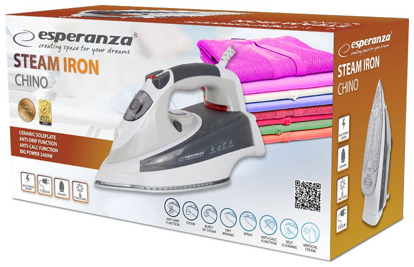Το σίδερο ατμού Esperanza CHINO είναι τέλειο για κάθε νοικοκυριό. Είναι εξοπλισμένο με λειτουργίες όπως έγχυση ατμού και προστασία από σταγόνες κατά το σιδέρωμα σε χαμηλότερες θερμοκρασίες. Η μοντέρνα κεραμική πλάκα δεν κολλάει και τρέχει τέλεια στο υλικό. Η ομοιόμορφη κατανομή θερμότητας σε ολόκληρη την πλάκα του σίδερου και η υψηλή ισχύς των 2400W θα επιταχύνει σίγουρα τη διαδικασία σιδερώματος. Έχει μοντέρνα, κομψή εμφάνιση. Το εργονομικό σχήμα θα κάνει το σιδέρωμα εύκολο και ευχάριστο.