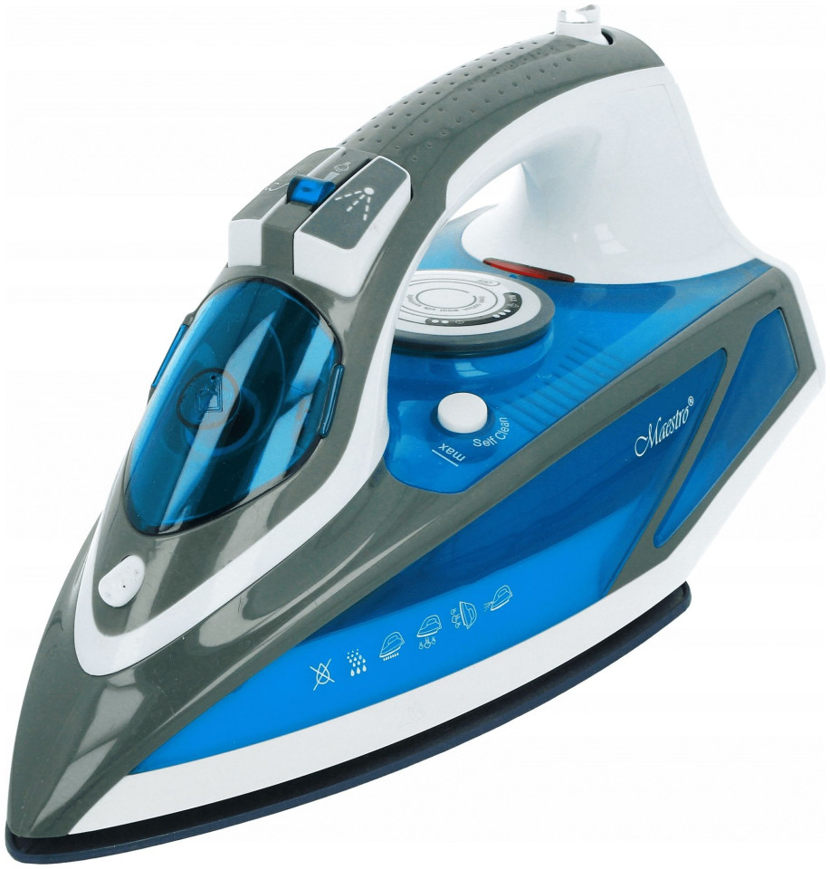 Σίδερο ατμού MAESTRO MR-304C{Type} Steam . {Drip stop} Όχι. {Σύστημα κατά της κλίμακας} Ναι. {Vertical ironing} Για κάθετο σιδέρωμα. {Foot Type} Κεραμικό . {Ισχύς} 2200 W . {Χρώμα} Μπλε . {Το σίδερο απενεργοποιείται αυτόματα} Όχι. {Cable length} Δεν υπάρχουν διαθέσιμα δεδομένα. {Χωρητικότητα δεξαμενής νερού} Δεν υπάρχουν διαθέσιμα δεδομένα. {Series} Κανένα . {Strong burst of steam} Κανένα . {Steam production} Δεν υπάρχουν διαθέσιμα δεδομένα