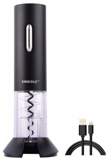 Ηλεκτρικό τιρμπουσόν κρασιού KINGHOFF με το οποίο μπορείτε εύκολα να ανοίξετε οποιοδήποτε μπουκάλι με φελλό. Τροφοδοτείται από μπαταρία (φόρτιση USB) και ασύρματη, που σας επιτρέπει να το χρησιμοποιείτε ελεύθερα χωρίς να χρειάζεται να το συνδέσετε σε σταθερή πηγή ρεύματος. Το σετ περιλαμβάνει επίσης ένα κόφτη μεμβράνης που χρησιμεύει και ως βάση για την επιφάνεια του τραπεζιού.