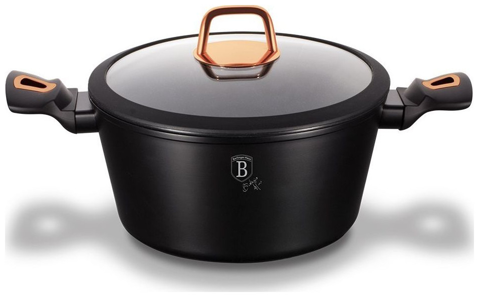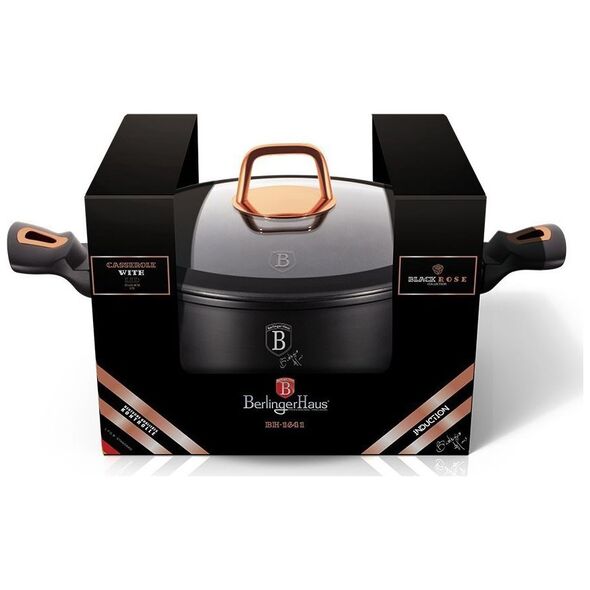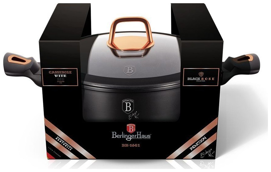 Οι γλάστρες και τα αξεσουάρ της σειράς BLACK ROSE της BERLINGER HAUS είναι κατασκευασμένα από σφυρήλατο αλουμίνιο υψηλής ποιότητας επικαλυμμένο με τριπλή επίστρωση γρανίτη (μάρμαρο) με πολύ υψηλό συντελεστή σκληρότητας. Εξωτερική επίστρωση σε μαύρο χρώμα. Αυτά τα ελκυστικά και μοντέρνα πιάτα είναι τυπικά εξοπλισμένα με λαβές SOFT TOUCH (λαβή σιλικόνης). Κατάλληλη για όλους τους τύπους κουζινών: αερίου, ηλεκτρική, κεραμική, αλογόνου, επαγωγική. Το σύστημα TURBO INDUCTION (θερμαίνονται πολύ γρήγορα) σας επιτρέπει να εξοικονομήσετε έως και 35% ενέργειας.