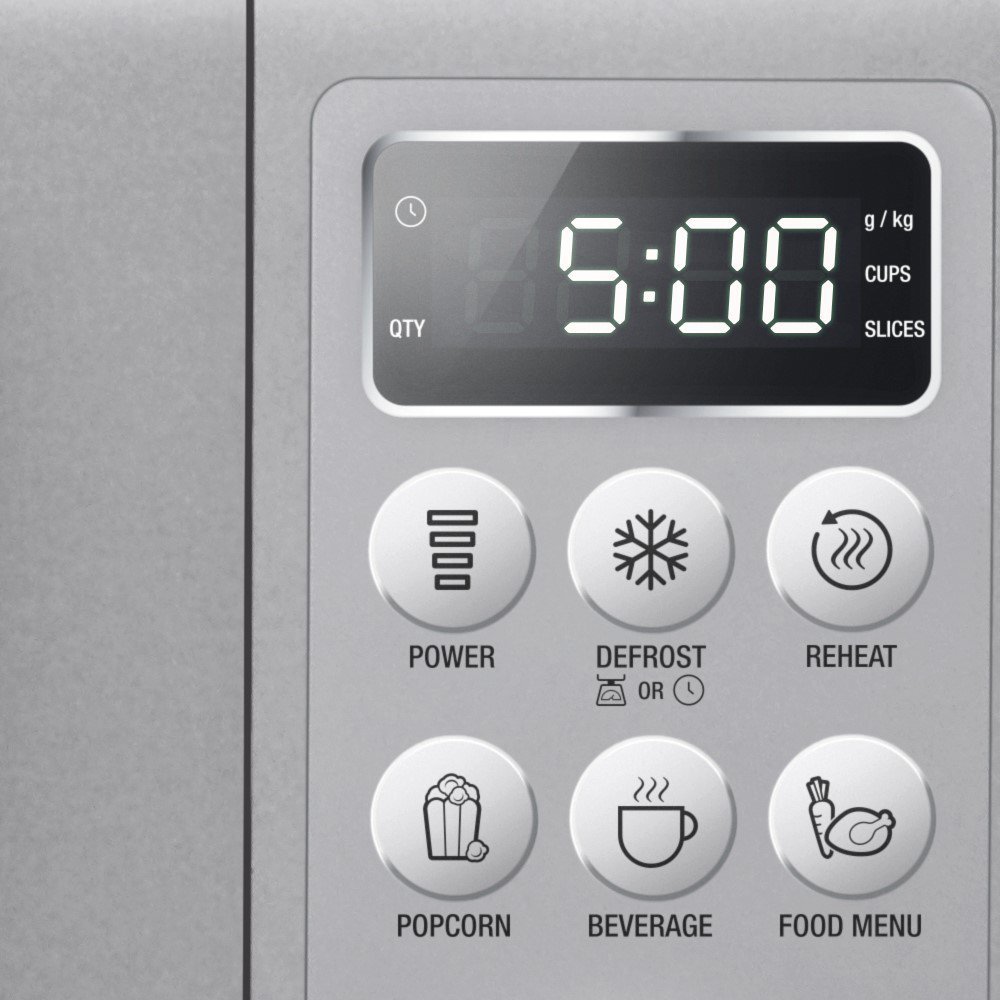 Compact Wave Soft Close jest wyposażony w automatyczne przyciski uruchamiane jednym dotknięciem, takie jak podgrzewanie, rozmrażanie, popcorn i napoje, które zapewniają dostęp do ulubionych ustawień dla Twojej wygody. Twórz szybkie i łatwe przekąski, korzystając z funkcji Menu Żywności: podgrzej pizzę, rozmroź warzywa lub ugotuj ziemniaki w krótszym czasie.