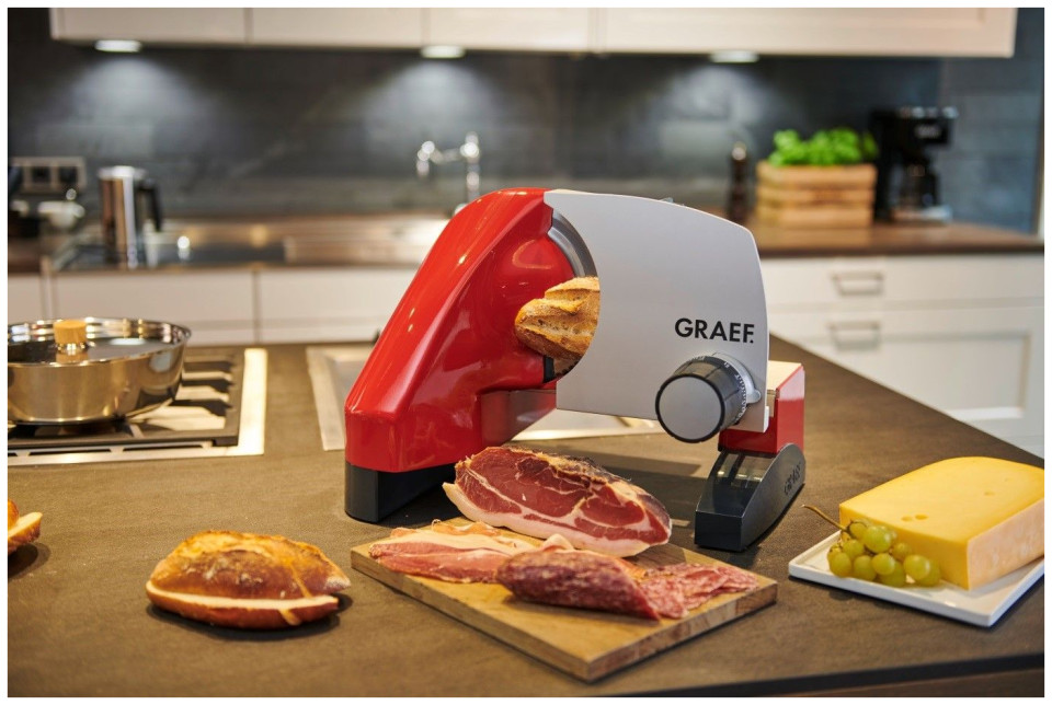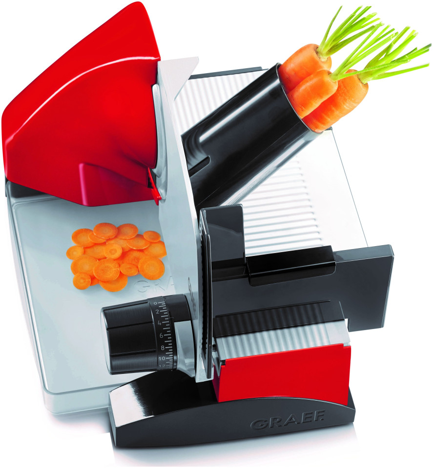Ομαλή ρύθμιση πάχους κοπής στην περιοχή 0-30 mm, διακόπτης γρήγορης δράσης και συνεχούς λειτουργίας. Οδοντωτή λεπίδα από ανοξείδωτο χάλυβα Ø 170 mm - κόβει ακόμη και σκληρά κελύφη. Διπλή παιδική κλειδαριά για μέγιστη ασφάλεια.