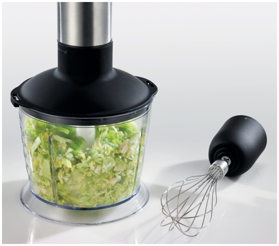 Blender ręczny o maksymalnej mocy 800 W. Wyposażony w poczwórne ostrze. Wytrzymały silnik prądu stałego. Funkcja pracy pulsacyjnej. W zestawie pojemnik z miarką 0.5 l, rozdrabniacz, stojak oraz trzepaczka.