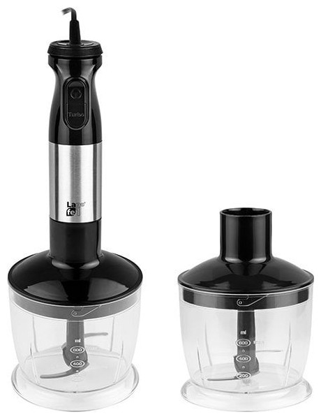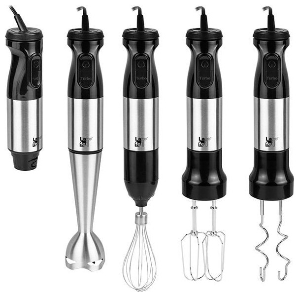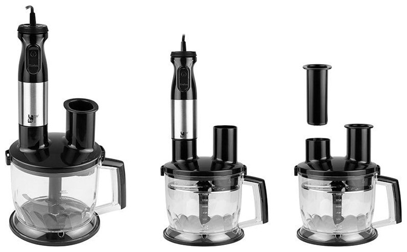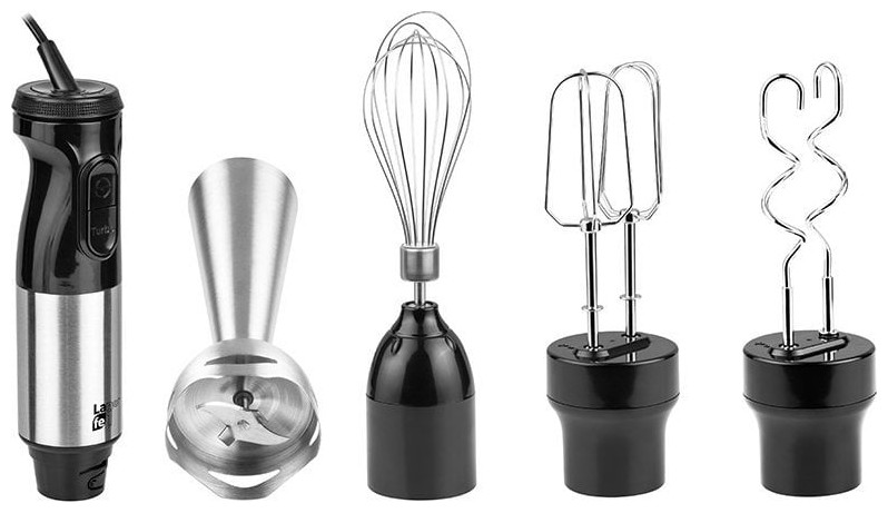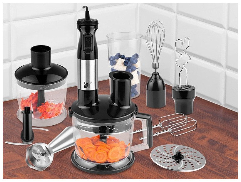 Περιλαμβάνονται αξεσουάρ: Μύτη ανάμειξης, μύτη χτυπήματος αφρού, εξάρτημα παρασκευής πουρέ, πολυλειτουργικός επεξεργαστής τροφίμων με δοχείο 1 λίτρου, τρίφτες φρούτων και λαχανικών, κόφτης με δοχείο 500 ml, φλιτζάνι 700 ml.