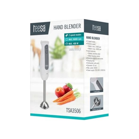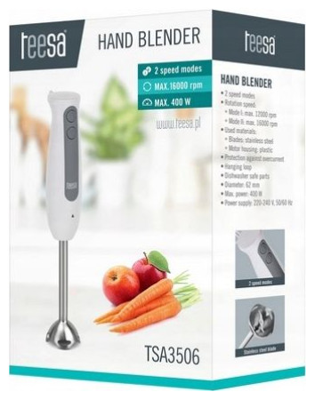 Każda Pani domu wie, że blender to urządzenie, które z pewnością powinno znajdować się na wyposażeniu każdej kuchni. W zależności potrzeb możesz korzystać z zaawansowanych zestawów blendujących lub wybrać model, który w codziennych pracach kuchenny spełni wszystkie Twoje oczekiwania. Takim właśnie urządzeniem jest blender TSA3506 marki Teesa. To niezwykle wygodne i łatwe w obsłudze urządzenie zostało wyposażone w wysokiej jakości ostrza ze stali nierdzewnej, dlatego masz pewność, że posłuży Ci ono długo. Blender z pewnością szybko przypadnie Ci do gustu nie tylko wizualnie, ale też dzięki dwóm prędkościom pracy, które sprawiają, że idealnie sprawdzi się do przygotowania zup, kremów czy koktajli. Model ten to idealne rozwiązanie dla posiadaczy małych powierzchni kuchennych - urządzenie zajmuje niewiele miejsca na blacie kuchennym, a dzięki dołączonemu uchwytowi można go również zawiesić na ścianie. 2 tryby prędkości Ilość obrotów: - Tryb I: maks. 12000 obrotów/minutę - Tryb II: maks. 16000 obrotów/minutę Użyte materiały: - Ostrza: stal nierdzewna - Obudowa części silnikowej: plastik Zabezpieczenie przed przeciążeniem Uchwyt do powieszenia Niektóre elementy można myć w zmywarce Waga: 651 g Wysokość: 372 mm Średnica: 62 mm Moc maks.: 400 W Zasilanie: 220-240 V, 50/60 Hz