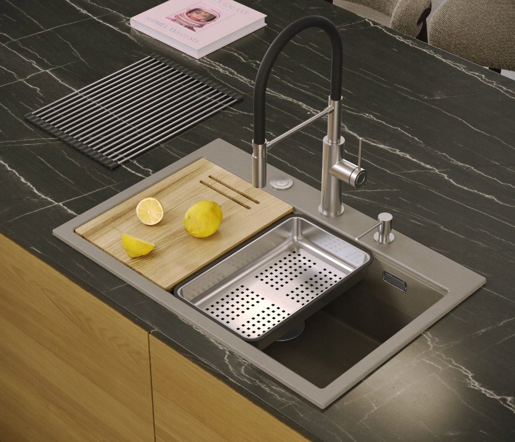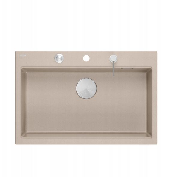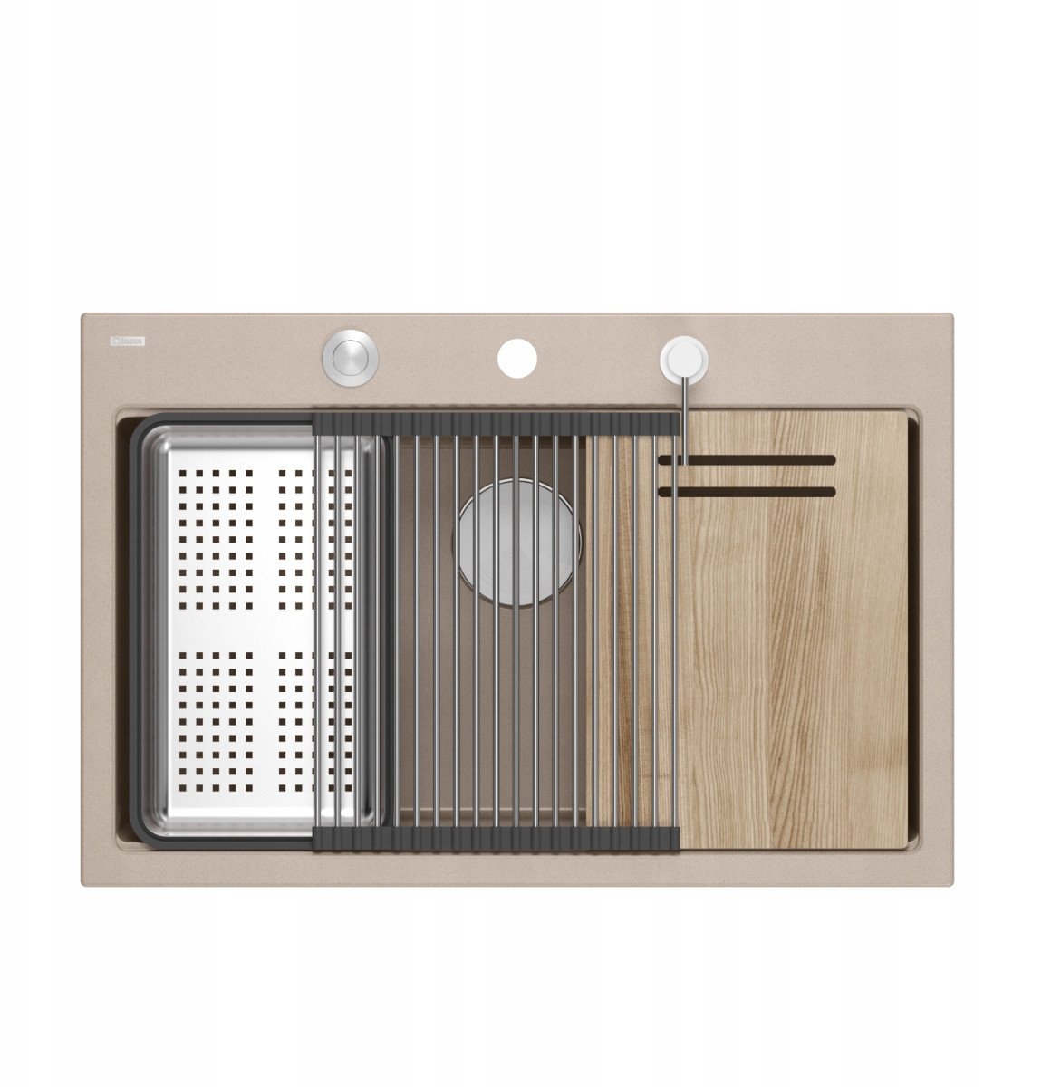 MARC 110 WORKSTATION GraniteQ νεροχύτης 1-θάλαμος 760*500*235 mm pearl beige + σιφόνι push to open + διανομέας ανοξείδωτο ατσάλι + ένθετο αποστράγγισης + Qmata + σανίδα/ μεταλλικά στοιχεία