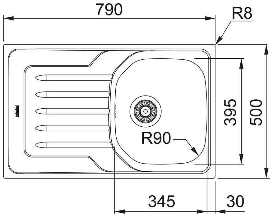 Νεροχύτης μονής λεκάνης με στραγγιστή, διαστάσεων 790 x 500 mm. Ελάχιστο πλάτος ντουλαπιού 450 mm. Κατασκευασμένο από ανοξείδωτο χάλυβα. Αναστρέψιμο μοντέλο.