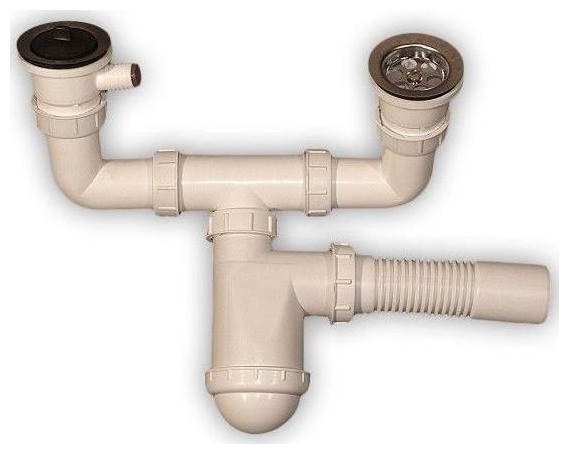 Σιφόνι νεροχύτη 2 θαλάμων. Περιγραφή προϊόντος: - σιφόνι νιπτήρα δύο τμημάτων, -μεταλλικά φίλτρα, - δυνατότητα σύνδεσης πλυντηρίου ρούχων/πιάτων, -λευκό χρώμα, - Πολωνικό προϊόν.{Purpose} Για τον νεροχύτη
