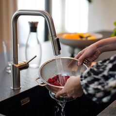 KFA μπαταρία κουζίνας με λειτουργία φιλτραρίσματος νερού και αποσπώμενο στόμιο Duero Pure Move Pull-Out + σετ φίλτρων Profine Blue S, brushed gold 6623-423-31