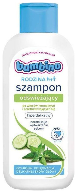 Το αναζωογονητικό σαμπουάν Bambino FAMILY δημιουργήθηκε με τη μεγαλύτερη φροντίδα για να περιποιηθεί τα μαλλιά και το τριχωτό της κεφαλής όλης της οικογένειας! Εμπλουτισμένη με πολύτιμα συστατικά και εκχυλίσματα φυσικής προέλευσης, η φόρμουλα καθαρίζει τα μαλλιά και το τριχωτό της κεφαλής, μειώνει τη λιπαρότητα και δεν βαραίνει τα μαλλιά. Το σαμπουάν δεν περιέχει σιλικόνες, διευκολύνει το χτένισμα και δεν τσούζει τα μάτια. Μπορεί να χρησιμοποιηθεί στην καθημερινή περιποίηση μαλλιών από την ηλικία των 3 ετών. Το προϊόν εφευρέθηκε και κατασκευάστηκε στην Πολωνία. Οφέλη: • Υπερήπια προστασία και περιποίηση μαλλιών και τριχωτού • Περιέχει εκχυλίσματα φυσικής προέλευσης • Καθαρίζει και δυναμώνει τα μαλλιά και αποτρέπει το βάρος τους • Διευκολύνει το χτένισμα και δεν τσούζει τα μάτια • Χωρίς σιλικόνη Τρόπος χρήσης: Απλώστε το σαμπουάν και απλώστε σε βρεγμένα μαλλιά, λουστείτε για 2 λεπτά και μετά ξεπλύνετε καλά με νερό. Μπορείτε να επαναλάβετε τη δράση εάν είναι απαραίτητο.{Type} Σε κανονικό . {Type} Για λιπαρό δέρμα. {Ιδιότητες} Καθαρισμός. {Ιδιότητες} Ενίσχυση. {Συσκευασία} Μπουκάλι . {Type} Τζελ μπάνιου. {Formula} Standard . {Χωρητικότητα [ml]} 400 . {Ιδιότητες} Αναζωογονητικό . {Ιδιότητες} Ενίσχυση. {Packaging} Άλλο . {Formula} Χωρίς σιλικόνη. {Type} Άλλο . {Προορίζεται} Για παιδιά