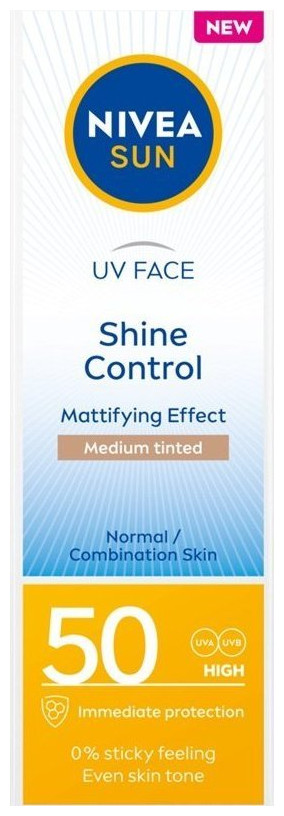 Nivea Nivea Sun UV Face Shine Control ματ κρέμα προσώπου με υψηλή προστασία SPF50 Medium Tinted 50ml{Type} Στο σώμα . {Ιδιότητες} Ενυδατική. Σωλήνας {Packaging}. {Filters} Δεν υπάρχουν διαθέσιμα δεδομένα. {Χωρητικότητα [ml]} 50 ml . {Προβλεπόμενη χρήση} Για ενήλικες