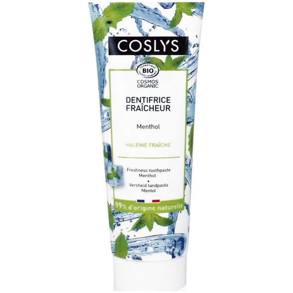 Ο συνδυασμός αιθέριων ελαίων μενθόλης και μέντας δίνει στη δροσιστική οδοντόκρεμα Coslys τη δύναμή της, συμβάλλοντας στην καλύτερη στοματική υγιεινή και φρέσκια αναπνοή. Το 99% των συστατικών είναι φυσικής προέλευσης. Δεν περιέχει φθόριο ή διοξείδιο του τιτανίου. Μενθόλη και μέντα: παρέχουν ισχυρή αναζωογονητική και διεγερτική δράση συμβάλλοντας στην καλύτερη στοματική υγιεινή. Αλόη: θρεπτικές, αναπλαστικές, μαλακτικές, προστατευτικές ιδιότητες.