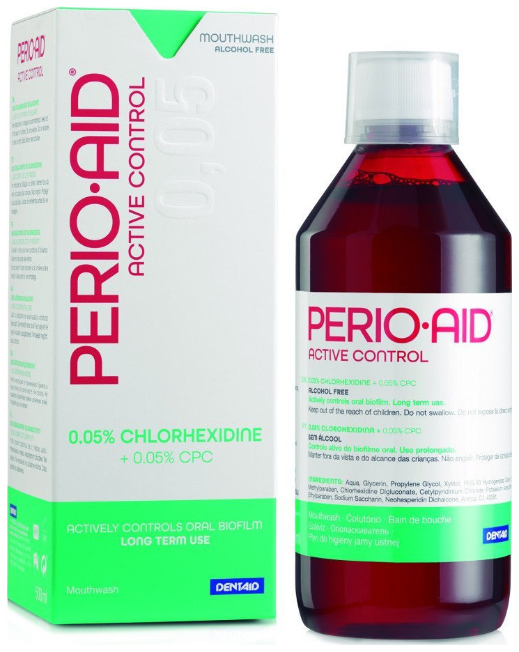 Perio·Aid Active Control 0,05%, αντιβακτηριδιακό υγρό, που προορίζεται για καθημερινή χρήση σε περίπτωση συχνών στοματικών παθήσεων και στη φάση συντήρησης της θεραπείας μετά τη χρήση Perio-Aid 0,12%. {Ιδιότητες} Αντιβακτηριδιακό. {Formula} Standard . {Χωρητικότητα [ml]} 500 . {Type} Υγρά