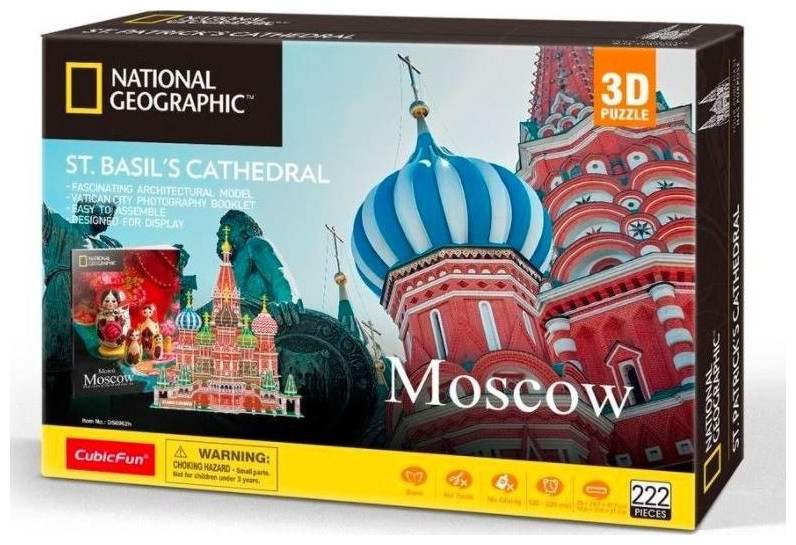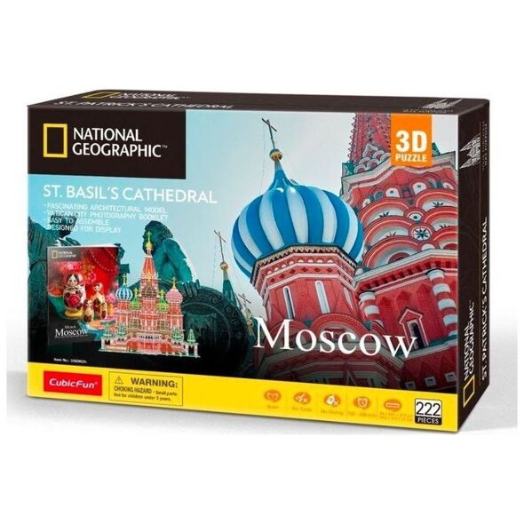 Παζλ του καθεδρικού ναού του Αγίου Basil με άδεια από το National Geographic. Η συσκευασία περιέχει 222 παζλ από ειδικό υλικό που μοιάζει με αφρό. Τα παζλ αριθμούνται, κόβονται και τοποθετούνται σε φύλλα. Απλώς πιέστε το στοιχείο έξω από το φύλλο χωρίς να χρησιμοποιήσετε δύναμη και συναρμολογήστε το σύμφωνα με τις συνημμένες οδηγίες, χωρίς να χρησιμοποιήσετε κόλλα ή ειδικά εργαλεία. Το μέγεθος της δομής μετά τη συναρμολόγηση είναι 24,7 x 29 x 37,7 cm. Εκτός από τα παζλ, το πακέτο περιλαμβάνει και έναν πρακτικό οδηγό με 28 σελίδες με ενδιαφέροντα γεγονότα.{Ηλικία} Από 7 ετών. {Θέμα} Κτίριο . {Ηλικία} Από 14 ετών. {Type} Παζλ . {Αριθμός αντικειμένων} 222