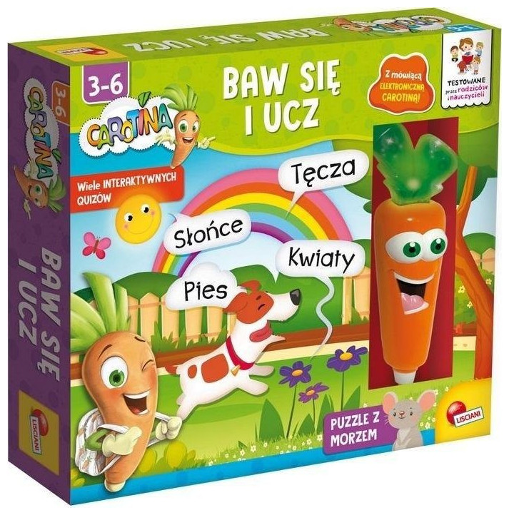 Opakowanie zawiera 8 interaktywnych kart oraz puzzle z morskimi przyjaciółmi do odkrywania i nauki w towarzystwie Carotiny. Aby odpowiedzieć, naciśnij końcówką długopisu czarną kropkę przy wybranej odpowiedzi. Po wybraniu prawidłowej, Carotina nagradza dziecko radosnym okrzykiem. W przypadku błędnej, smutnym westchnięciem motywuje do kolejnej próby. Miłej zabawy!