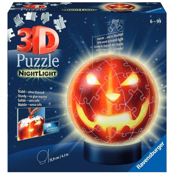 Δημιουργήστε μοναδικές τρισδιάστατες κατασκευές με τρισδιάστατα παζλ από το Ravensburger! Ανακαλύψτε έναν νέο τρισδιάστατο τρόπο επίλυσης γρίφων. Τα στοιχεία αυτών των παζλ είναι κατασκευασμένα από άκαμπτο πλαστικό, το οποίο επιτρέπει στη δομή να συγκρατείται χωρίς τη χρήση κόλλας. Τα τακτοποιημένα αντικείμενα δεν διαλύονται και τα παζλ κολλάνε μεταξύ τους σφιχτά. Το υλικό που χρησιμοποιείται για την παραγωγή των μπλοκ καθαρίζεται εύκολα, απλά χρησιμοποιήστε ένα υγρό πανί Μια κολοκύθα που λάμπει στο σκοτάδι είναι κάτι για τους λάτρεις του Halloween. Η τρισδιάστατη δομή παζλ είναι μια πιστά αναπαραχθείσα κολοκύθα αποκριών που μπορείτε να κρατήσετε στο σπίτι. Εκτός από το παζλ, το σετ περιλαμβάνει επίσης βάση και φώτα LED Περιεχόμενα και χαρακτηριστικά του σετ: 72 κομμάτια παζλ Φως LED Το σετ δεν περιλαμβάνει μπαταρίες{Ηλικία} Από 6 ετών. {Ηλικία} Από 6 ετών. {Αριθμός στοιχείων} 72 . {Αριθμός στοιχείων} 72 . {Θέμα} Θέμα . Παζλ {Type}