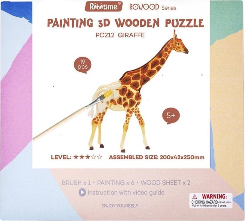 Drewniane puzzle 3D w kształcie żyrafy, wykonane z wysokiej jakości sklejki. Opakowanie zawiera pędzelek oraz farby akrylowe, którymi można pomalować model po złożeniu. Zestawy mają postać arkuszy z wstępnie wyciętymi i ponumerowanymi elementami, które przed montażem należy oddzielić od wykroju, a następnie połączyć bez użycia kleju, zgodnie ze szczegółową instrukcją dołączoną do opakowania. Zabawka edukacyjna pobudzająca dziecięcą wyobraźnię i kreatywność.