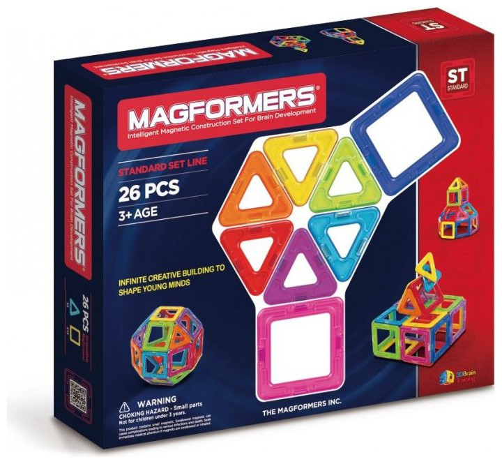 MAGFORMERS BASIC 26 to klocki z wbudowanymi silnymi magnesami neodymowymi, które zawsze się przyciągają. Wystarczy zbliżyć do siebie ściankami dwa klocki, a one natychmiast ze sobą się połączą. Za pomocą klocków wzorowanych na kształt figur geometrycznych można zbudować wspaniałe trójwymiarowe budowle. W zabawie można korzystać z dołączonej do zestawu instrukcji lub innych przykładów zamieszczonych na stronie magformersworld.com lub własnej wyobraźni.