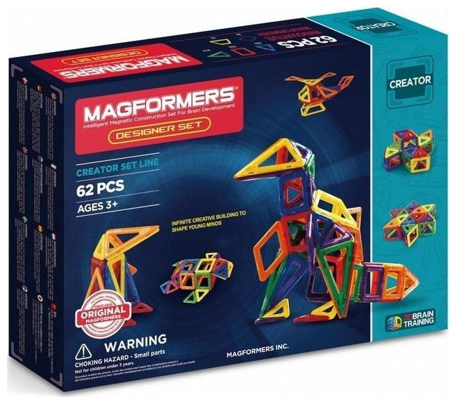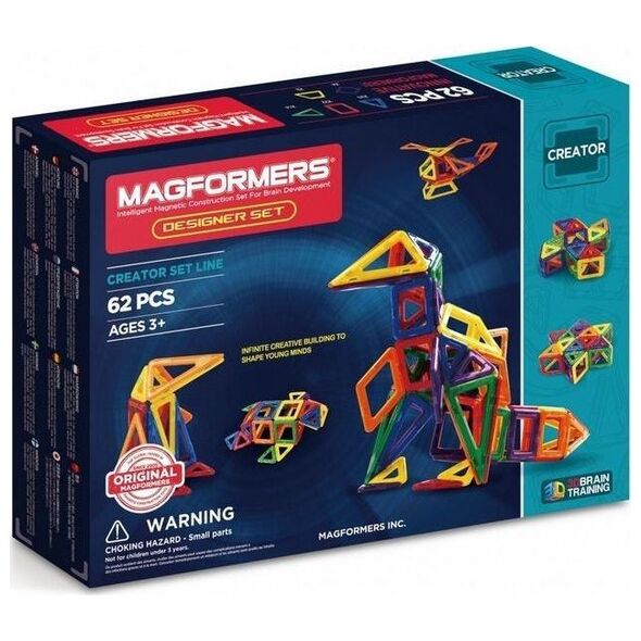 Τα MAGFORMERS CREATOR DESIGNER 62 είναι μπλοκ με ενσωματωμένους ισχυρούς μαγνήτες νεοδυμίου που έλκονται πάντα μεταξύ τους. Απλώς φέρτε δύο μπλοκ μαζί με τους τοίχους τους και θα συνδεθούν αμέσως. Χρησιμοποιώντας μπλοκ που έχουν διαμορφωθεί σε σχήμα γεωμετρικών μορφών, μπορείτε να φτιάξετε υπέροχα τρισδιάστατα κτίρια. Στο παιχνίδι, μπορείτε να χρησιμοποιήσετε τις οδηγίες που περιλαμβάνονται στο σετ ή άλλα παραδείγματα που είναι διαθέσιμα στον ιστότοπο magformersworld.com ή τη δική σας φαντασία. Το σετ περιλαμβάνει: 20 τρίγωνα. 22 τετράγωνα? 14 ψηλά τρίγωνα. 4 ρόμβοι? 2 τραπεζάκια? εντολή