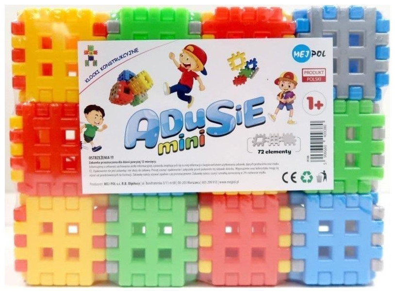 Ponadczasowe klocki w nowej odsłonie. Podstawowy klocek ma wielkość 65x9x65mm. Układanie klocków niesie za sobą wiele korzyści pobudza wyobraźnie poprawia małą motorykę pozwala na naukę kolorów planowania przestrzennego oraz logicznego myślenia. Dzięki pomniejszeniu klasycznych wafli już najmłodsze dzieci mogą korzystać z plusów które daje układanie klocków. Produkt przeznaczony dla dzieci powyżej 1 roku. Wykonany w Polsce z atestowanych surowców.