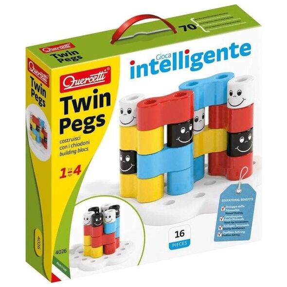 Zestaw Twin Pegs pozwala dzieciom w wieku od 1. roku życia budować ściany, wieże i inne konstrukcje, które mogą wymyślić na macie w kształcie kwiatu. Zestaw zawiera podkładkę i 15 dużych, wielokolorowych kołków w dwóch rodzajach, które można układać zarówno na macie, jak i bezpośrednio na sobie.