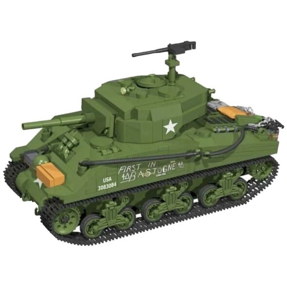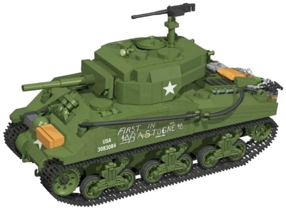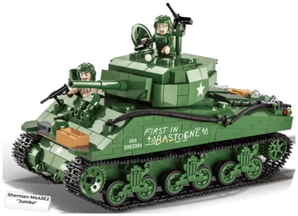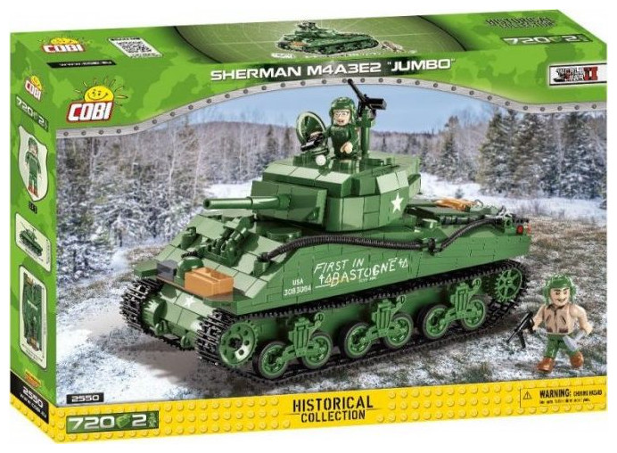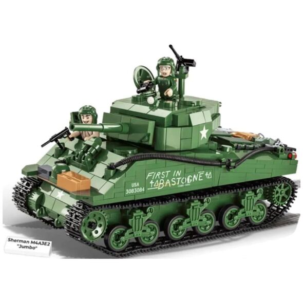 Z zestawu 720 klocków konstrukcyjnych COBI wybudujesz najbardziej znanego spośród Shermanów — model M4A3E2 JUMBO, czyli egzemplarz Cobra King, który jako pierwszy wjechał do belgijskiego Bastogne. Model zawiera elementy pokryte wysokiej jakości nadrukami, które nie ścierają się nawet w trakcie intensywnego użytkowania. Na szczególną uwagę zasługuje bardzo charakterystyczne graffiti namalowane przez załogę czołgu. Konstrukcja doskonale odzwierciedla oryginalne kształty swojego historycznego pierwowzoru. Ruchome koła i pracujące gąsienice, otwierane włazy, dostęp do klockowego silnika, ruchoma wieża i lufa oraz dwie figurki gwarantują satysfakcję z posiadania tego inspirowanego prawdziwą historią zestawu! Całość uzupełnia tabliczka z nazwą pojazdu.Sherman Jumbo to pokaźny zestaw kolekcjonerski w sam raz dla osób mających doświadczenie w budowaniu bardziej złożonych zestawów. Pozycja obowiązkowa dla miłośników militariów i historii.Buduj historię, klocek po klocku!Sherman M4A3E2 "Jumbo" to krótka seria dobrze opancerzonych czołgów licząca zaledwie 254 egzemplarze. Shermany zostały uzbrojone w 75 mm działo zamontowane na zmodyfikowanym jarzmie M62.Jumbo o nazwie własnej "Cobra King" był jednym, który otrzymał działo 76 mm, a także współosiowy, karabin maszynowy. Został wydany 37. Batalionowi Czołgów, 4 Dywizji Pancernej pod koniec października 1944 roku i był czołgiem dowódcy kompani C. Czołg zasłynął w trakcie niemieckiej ofensywy zimą 1944 roku w Ardenach. Jako pierwszy przełamał niemieckie linie i dotarł do otoczonych w belgijskim Bastogne żołnierzy 101 Dywizji Powietrznodesantowej. Dla upamiętnienia tego doniosłego wydarzenia załoga czołgu namalowała specjalne graffiti, które zostało odwzorowane przez COBI przy pomocy trwałych nadruków. Dalsze losy czołgu są również nie mniej emocjonujące. Niektóre źródła podają, że czołg brał udział w „Operation Hammelburg”, czyli sekretnej misji generała Pattona, gdzie został zniszczony w marcu 1945 roku. Przez wiele lat wrak czołgu był eksponowany na pomnikach wojennych pod nieprawidłowym oznaczeniem. Dopiero w 2001 roku, kapelan wojskowy Keith Goode przyczynił się do odkrycia prawdziwej historii anonimowego wraku. Czołg został pieczołowicie wyremontowany w The Patton Museum i obecnie znajduje się w Forcie Benning w Georgii. W belgijskim Bastogne natomiast stanął odpowiednio pomalowany zamiennik słynnego Shermana "King Cobra".