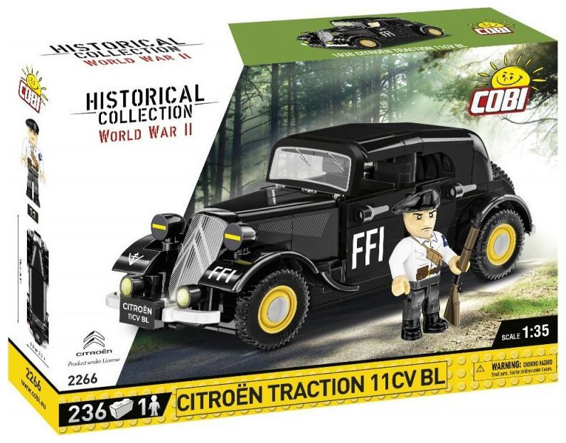 Το αυτοκίνητο Citroen Traction 11CV BL, που κυκλοφόρησε με άδεια από τον γίγαντα της αυτοκινητοβιομηχανίας από τη Γαλλία, είναι ένα κομμάτι ιστορίας που μπορείτε να χτίσετε τούβλο τούβλο! Το αρχικό αυτοκίνητο κατασκευάστηκε μεταξύ 1937 και 1957. Ξεχώριζε για το αυτοφερόμενο αμάξωμα και την κίνηση μπροστά. Το κοινώς αποδεκτό και ανεπίσημο όνομα του αυτοκινήτου είναι Traction Avant, που σημαίνει "μπροστινή κίνηση" στα γαλλικά. Το μοντέλο μας είναι εξοπλισμένο με ιστορικά εμβλήματα των Γαλλικών Δυνάμεων του Εσωτερικού (γαλλικά: Forces françaises de l'Intérieur). Το FFI ήταν μια ενοποιημένη οργάνωση που ένωνε όλα τα κόμματα της Γαλλικής Αντίστασης κατά τον Β' Παγκόσμιο Πόλεμο! Το σετ περιλαμβάνει μια φιγούρα ενός Γάλλου στρατιώτη της Αντίστασης και μια πινακίδα με το όνομα του οχήματος Το αυτοκίνητο Citroen Traction 11CV BL αναδημιουργήθηκε προσεκτικά χρησιμοποιώντας δομικά στοιχεία COBI. Το αυτοκίνητο συμπληρώνει την πλούσια συλλογή ιστορικών οχημάτων που κυκλοφόρησαν σε κλίμακα 1:35. Το μοντέλο αποτελείται από 236 στοιχεία και διαθέτει περιστρεφόμενους τροχούς και ανοιγόμενες πόρτες. Το σετ περιέχει μόνο εκτυπώσεις υψηλής ποιότητας που δεν φθείρονται ακόμη και με εντατική χρήση. Χάρη στις εκτυπώσεις και τους χαρακτήρες, το αυτοκίνητο παίρνει μια ακόμη πιο ιστορική διάσταση. Το σύνολο συμπληρώνεται από ένα τούβλο με το όνομα του αυτοκινήτου. Σίγουρα θα ικανοποιήσει τους λάτρεις της ιστορίας και της αυτοκινητοβιομηχανίας και χάρη στις απλές και εύχρηστες οδηγίες του, θα φέρει πολλή χαρά στην κατασκευή.