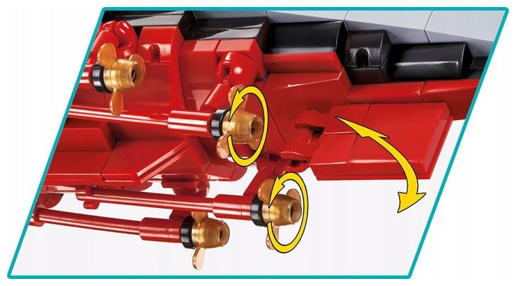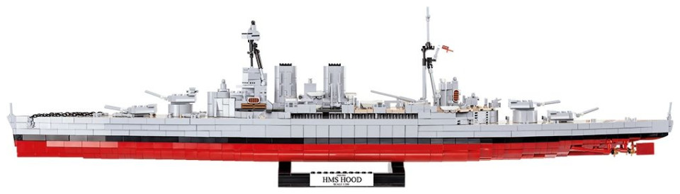 HMS Hood to brytyjski krążownik liniowy z okresu międzywojennego i II wojny światowej. Zwodowany w 1918 roku, wszedł do służby dwa lata później. Mierzył aż 262,3 m długości. Głównym uzbrojeniem artyleryjskim krążownika było osiem dział BL Mk I kaliber 381 mm. W okresie międzywojennym krążownik, jako największy okręt świata był wizytówką Royal Navy. Po wybuchu II wojny światowej i klęsce Francji przebazowano go do Gibraltaru, gdzie wszedł w skład Force H. Dnia 21 maja 1941 roku w towarzystwie pancernika „Prince of Wales”, wypłynął w swój ostatni rejs. Trzy dni później brytyjskie okręty starły się w Cieśninie Duńskiej z niemieckim pancernikiem „Bismarck” i towarzyszącym mu ciężkim krążownikiem „Prinz Eugen”. Po krótkim pojedynku artyleryjskim na dużym dystansie celny pocisk spowodował eksplozję wewnętrzną w rufowej części „Hooda”, która całkowicie zniszczyła okręt. Z liczącej 1418 osób załogi uratowano jedynie trzech marynarzy. Zatopienie "Hooda" wywołało szok w Wielkiej Brytanii.Klockowy Model HMS Hood został zaprojektowany w skali 1:300 i wiernie oddaje detale swojego historycznego pierwowzoru. Klockowy pancernik ma aż 88 cm / 34.6” długości i 22 cm / 8.7” wysokości. Posiada wiele ruchomych elementów, takich jak działa pokładowe, obrotowe wieże artyleryjskie, stery czy śruby napędowe. Model został pokryty wysokiej jakości nadrukami imitującymi oporządzenie i kamuflaż. Nadruki nie ścierają się nawet w trakcie intensywnej zabawy. Do zestawu dołączona jest czarna klockowa podstawka ekspozycyjna oraz biała tabliczka z nadrukowaną nazwą i skalą modelu. Okręt z pewnością zachwyci dorosłych i młodszych miłośników historii, militariów oraz marynistyki. Będzie znakomicie prezentował się na biurku, w regale z książkami, w gabinecie czy w pokoju młodego entuzjasty klocków.
